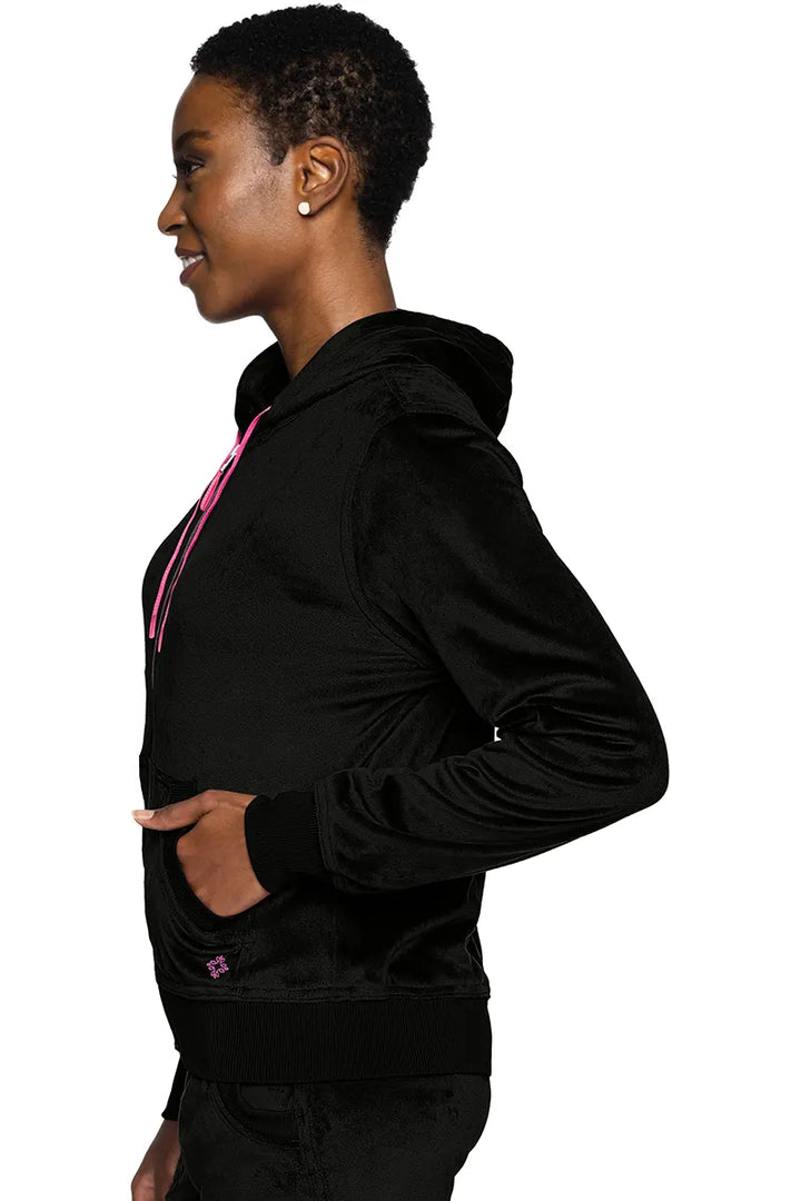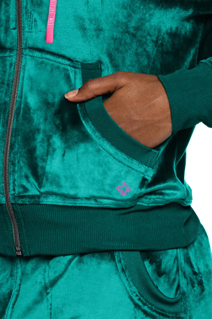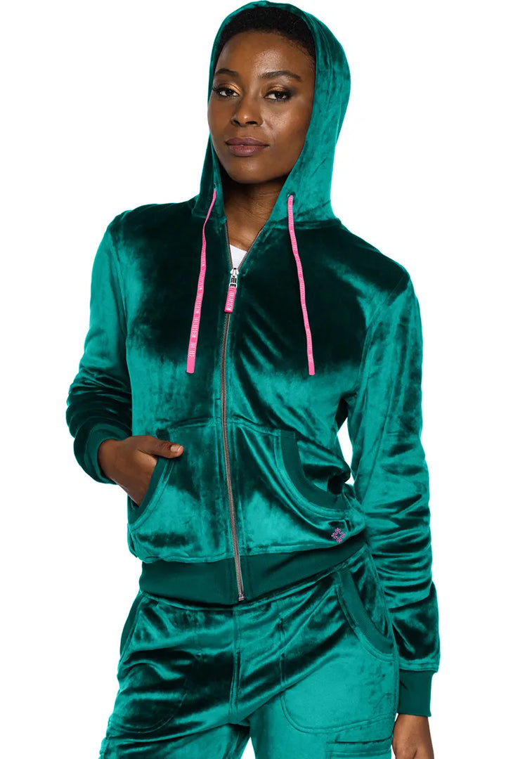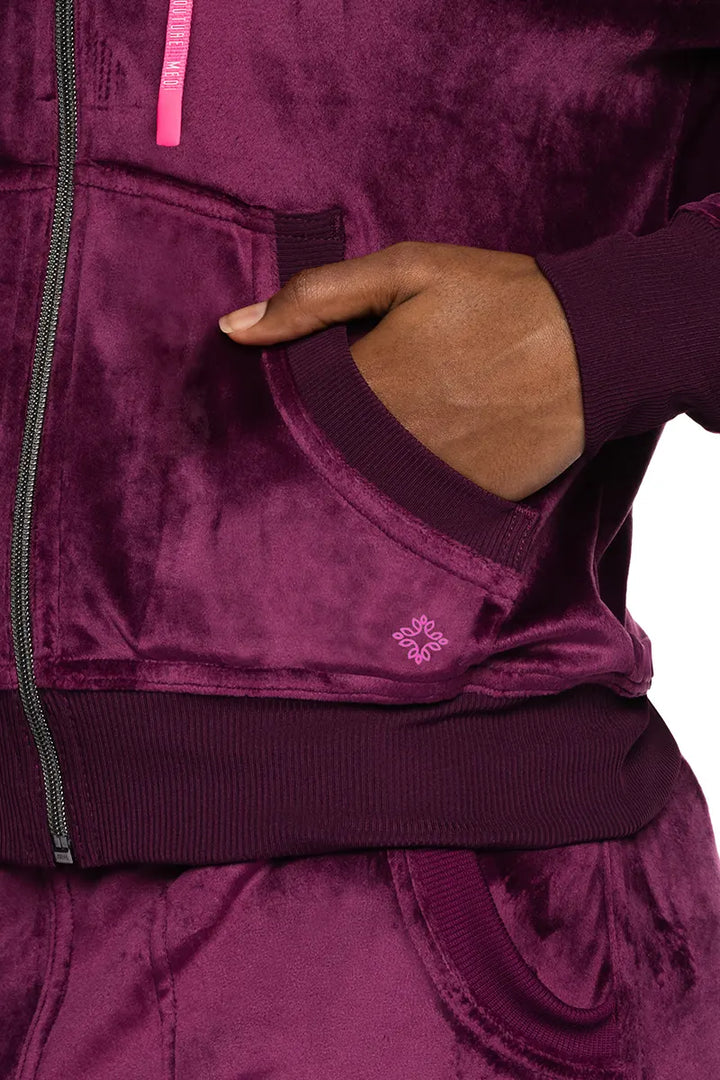 Chamarra con gorra para dama confeccionada en tejido atercipelado.