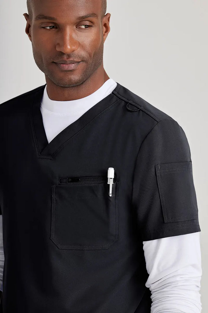 Su diseño moderno con cuello en V proyecta una imagen profesional, mientras que el elástico en el hombro izquierdo permite sujetar fácilmente la credencial de identificación. Cuenta con tres prácticas bolsas: una tipo parche y otra con cierre en el pecho izquierdo, además de una más en la manga izquierda para mayor funcionalidad.